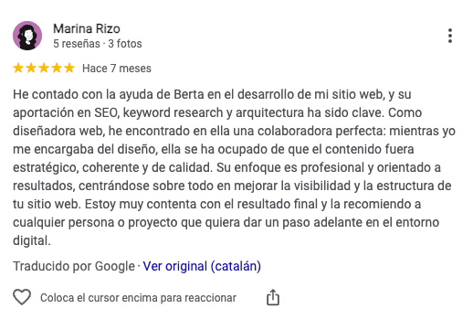 He contado con la ayuda de Berta en el desarrollo de mi sitio web, y su aportación en SEO, keyword research y arquitectura ha sido clave. Como diseñadora web, he encontrado en ella una colaboradora perfecta: mientras yo me encargaba del diseño, ella se ha ocupado de que el contenido fuera estratégico, coherente y de calidad. Su enfoque es profesional y orientado a resultados, centrándose sobre todo en mejorar la visibilidad y la estructura de tu sitio web. Estoy muy contenta con el resultado final y la recomiendo a cualquier persona o proyecto que quiera dar un paso adelante en el entorno digital.
